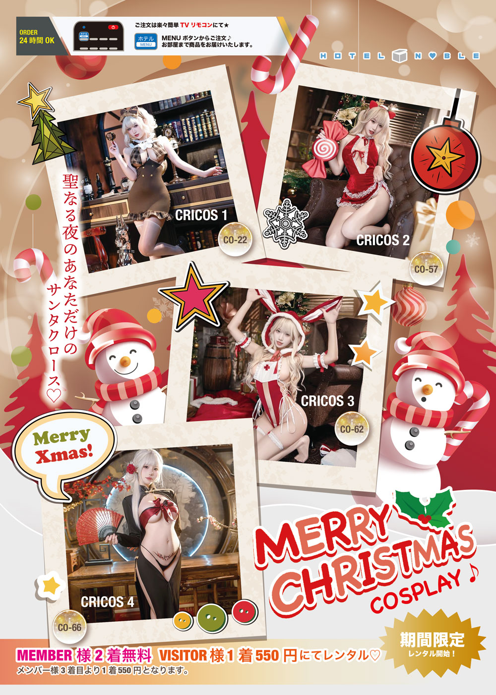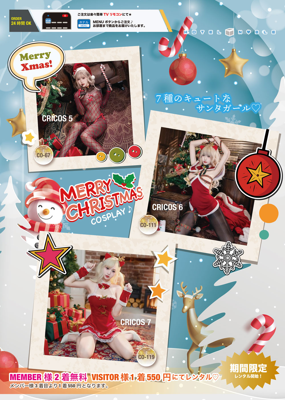 Update:2025.12.1 お知らせ 聖なる夜のあなただけのサンタクロース♡ NEW COSPLAY♡CLICOS〜クリコス〜レンタル開始♡ HOTEL NOBLEの大人気サービス 100種類以上のコスチュームラインに ”新作のクリスマスコスチューム”が仲間入り♡ サンタ クリコス 7種を是非お楽しみくださいませ♪ メンバー様 2着無料/ビジター様 1着550円でご利用いただけます。